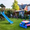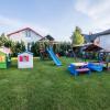 Przed każdym domkiem komplet drewniany (stół + 2 ławki), a także grill